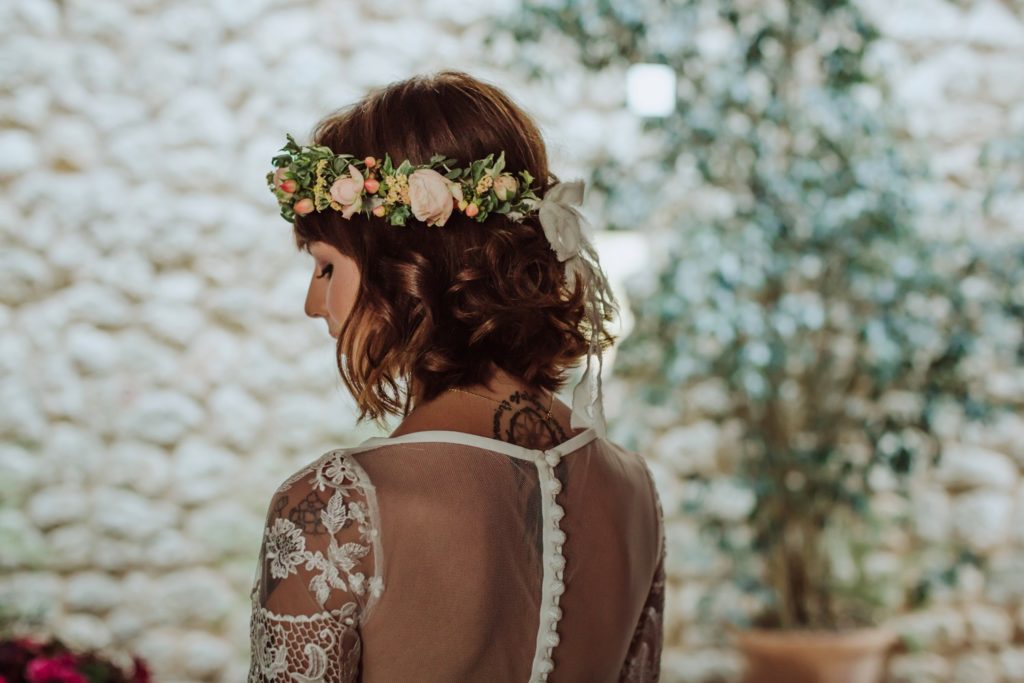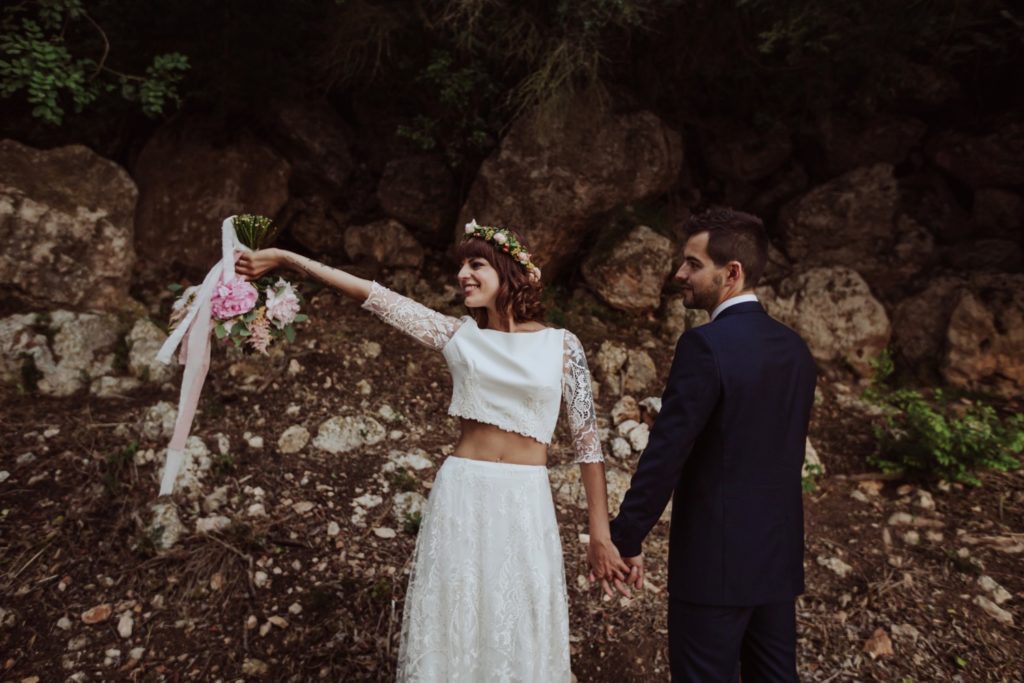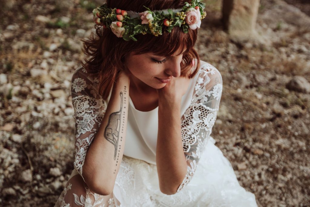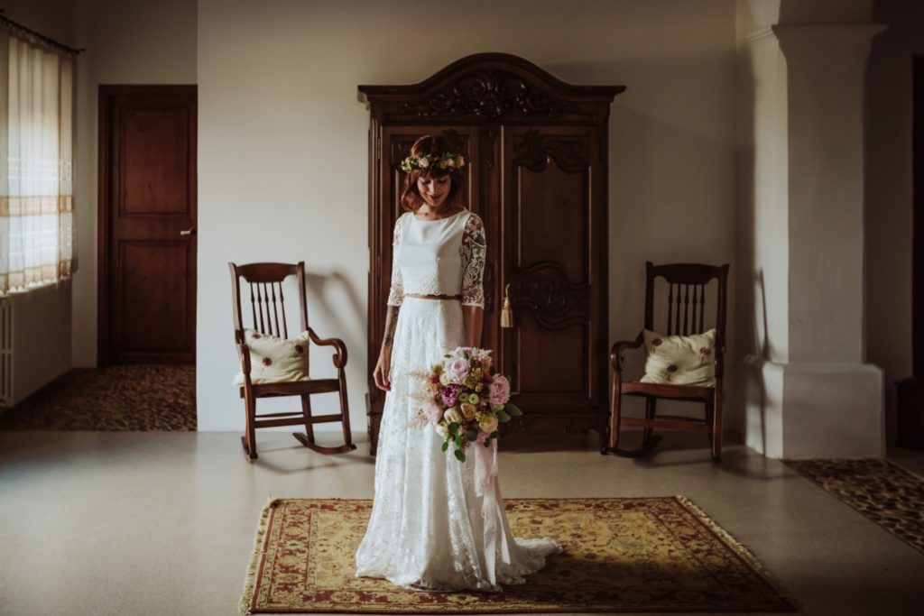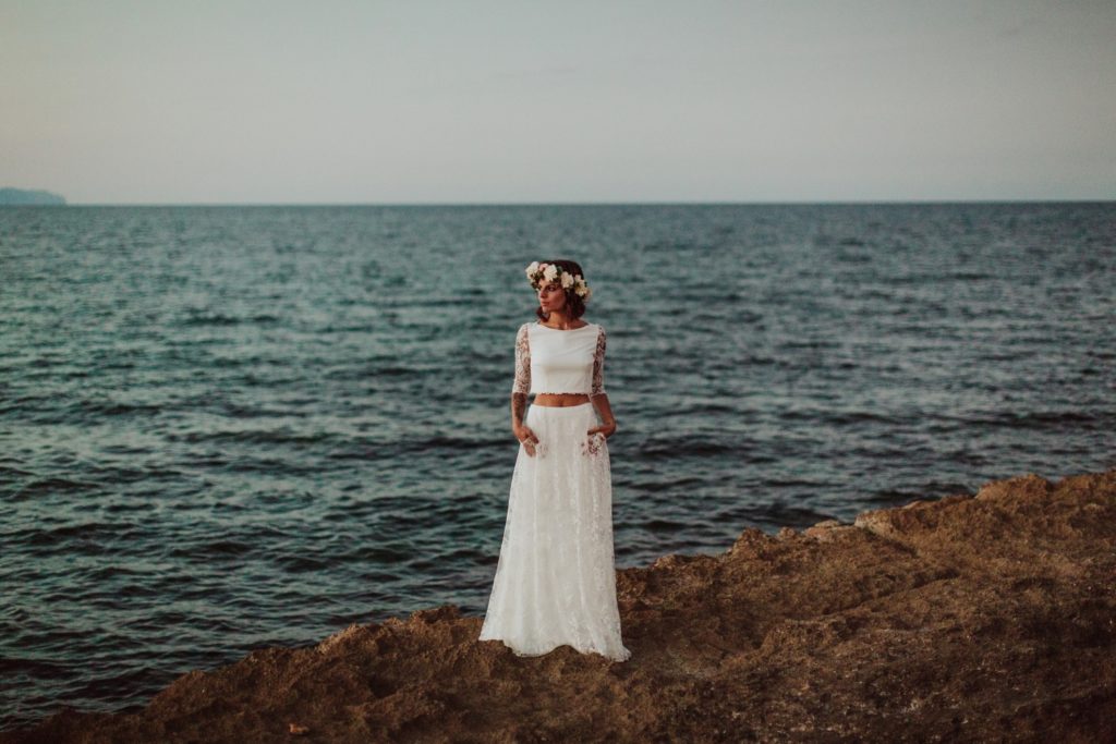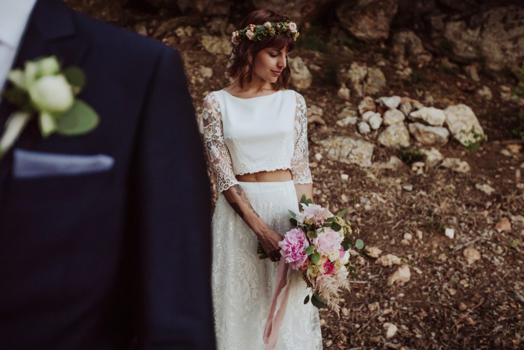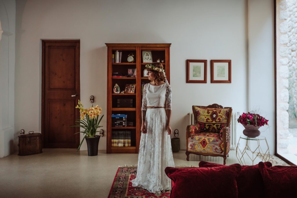 Neus is a beautiful young woman who left us speechless with her two-pieces dress by Company, plus a bouquet and floral crown of Francis Garcia for Mille Papillons. The flowers in peach tones softened the boho style giving it a sweet and romantic touch.