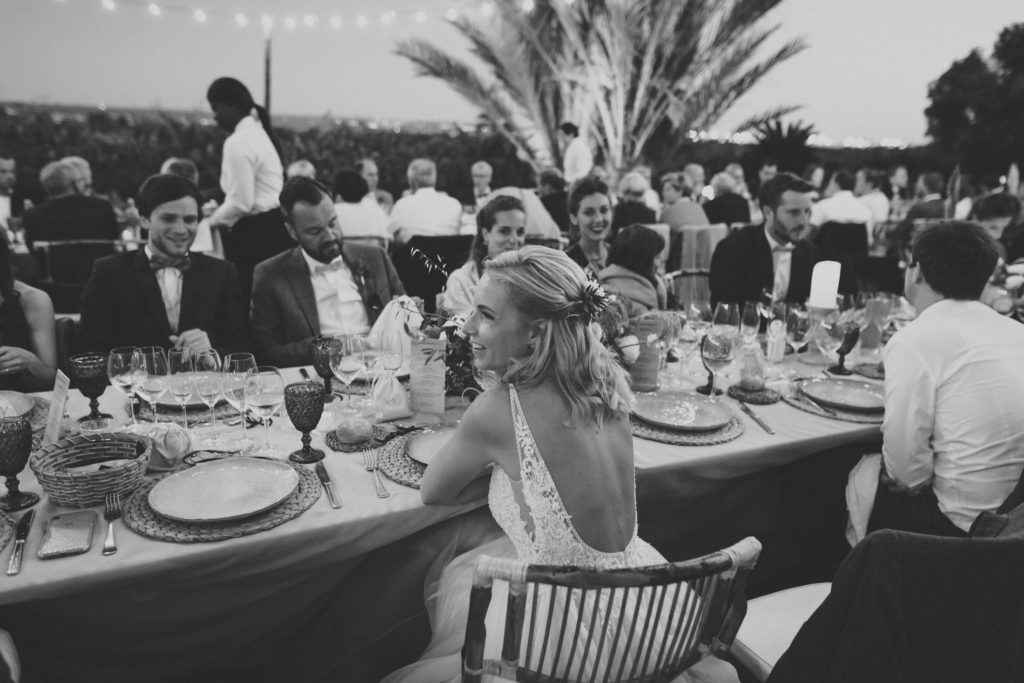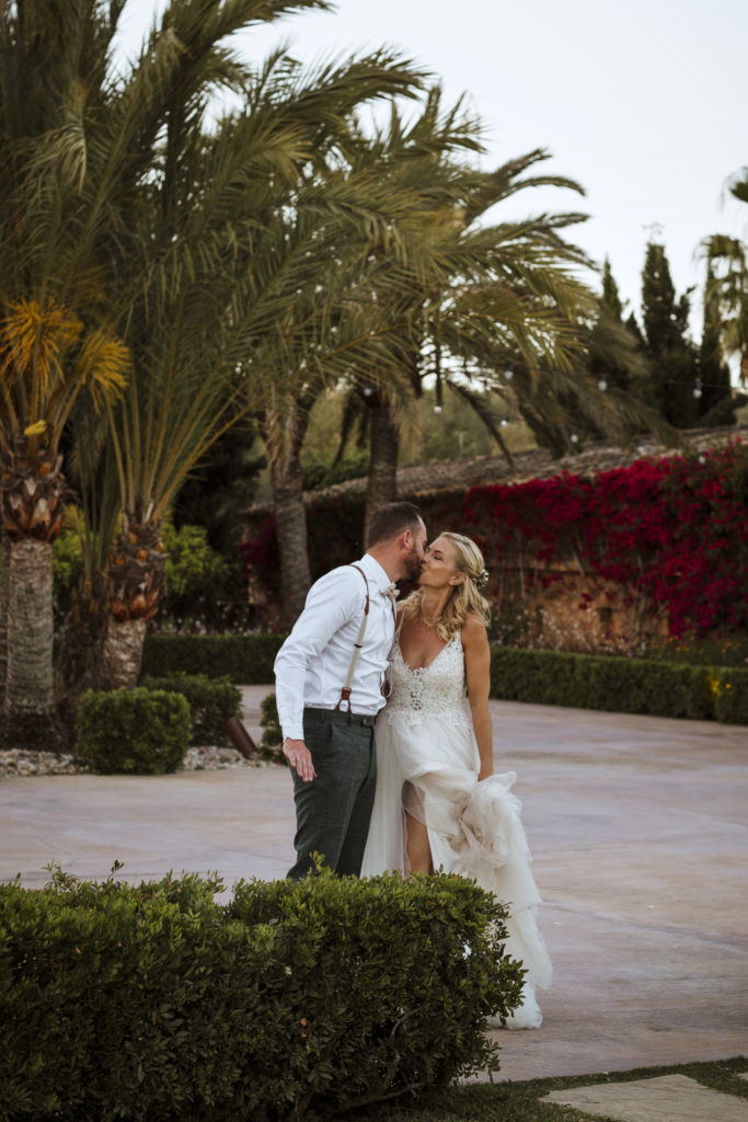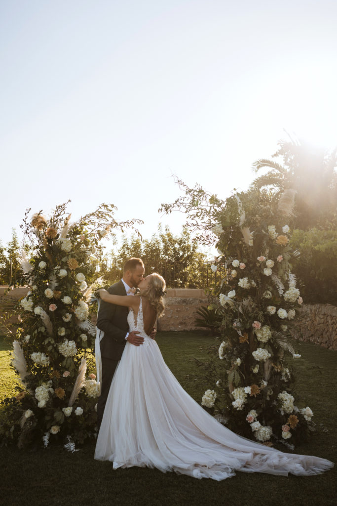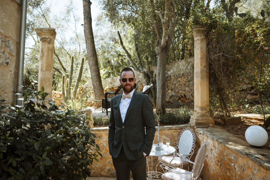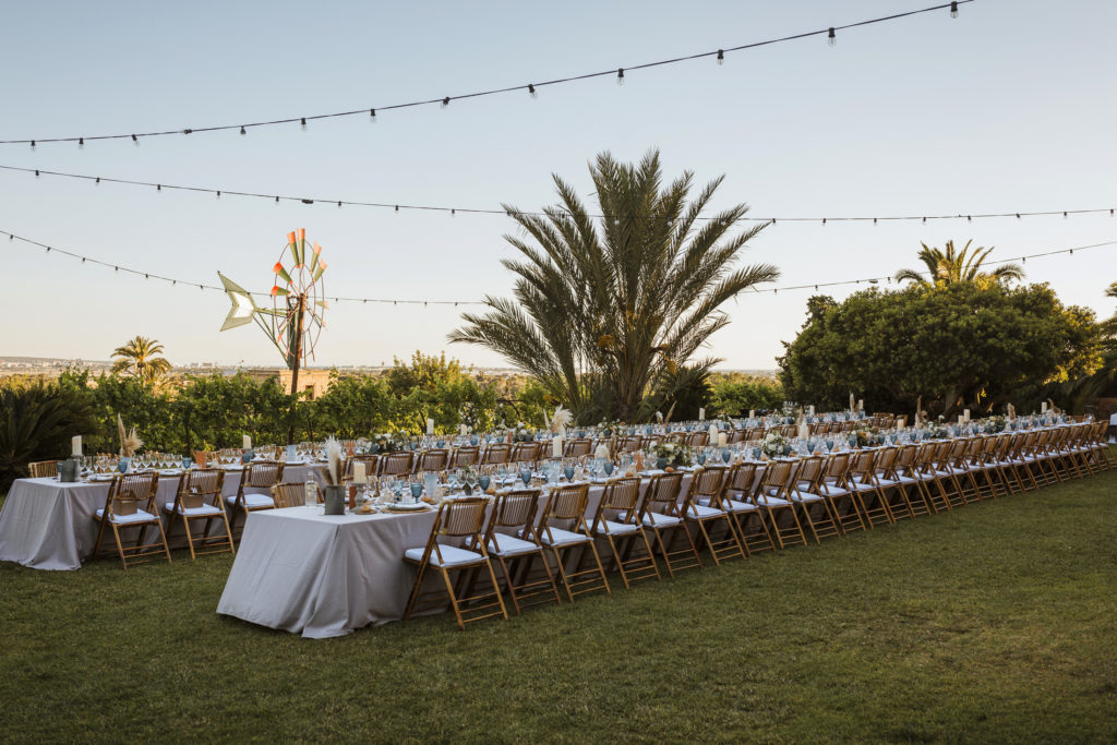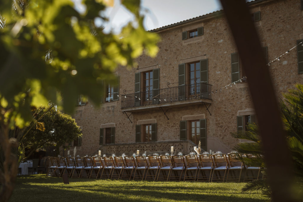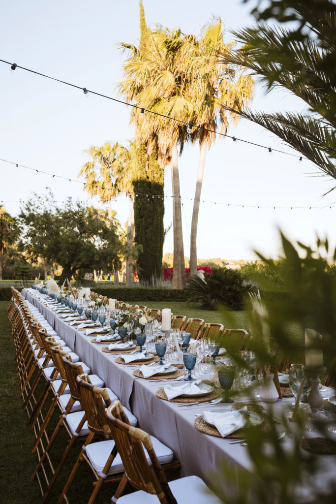The wedding and the dinner were in finca Son Mir where Judith from Mille Papillons organized an outdoor wedding from the ceremony in the gardens to the cocktail reception in the courtyard of the venue. For the dinner they discovered other beautiful spaces of this beautiful location in front of the facade.